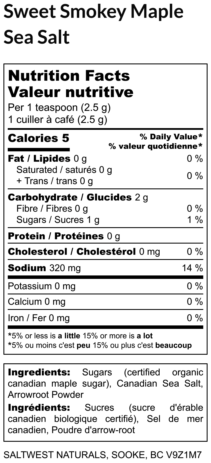Certified Organic Maple Sugar, Maplewood Smoked Canadian Sea Salt, Arrowroot Powder.